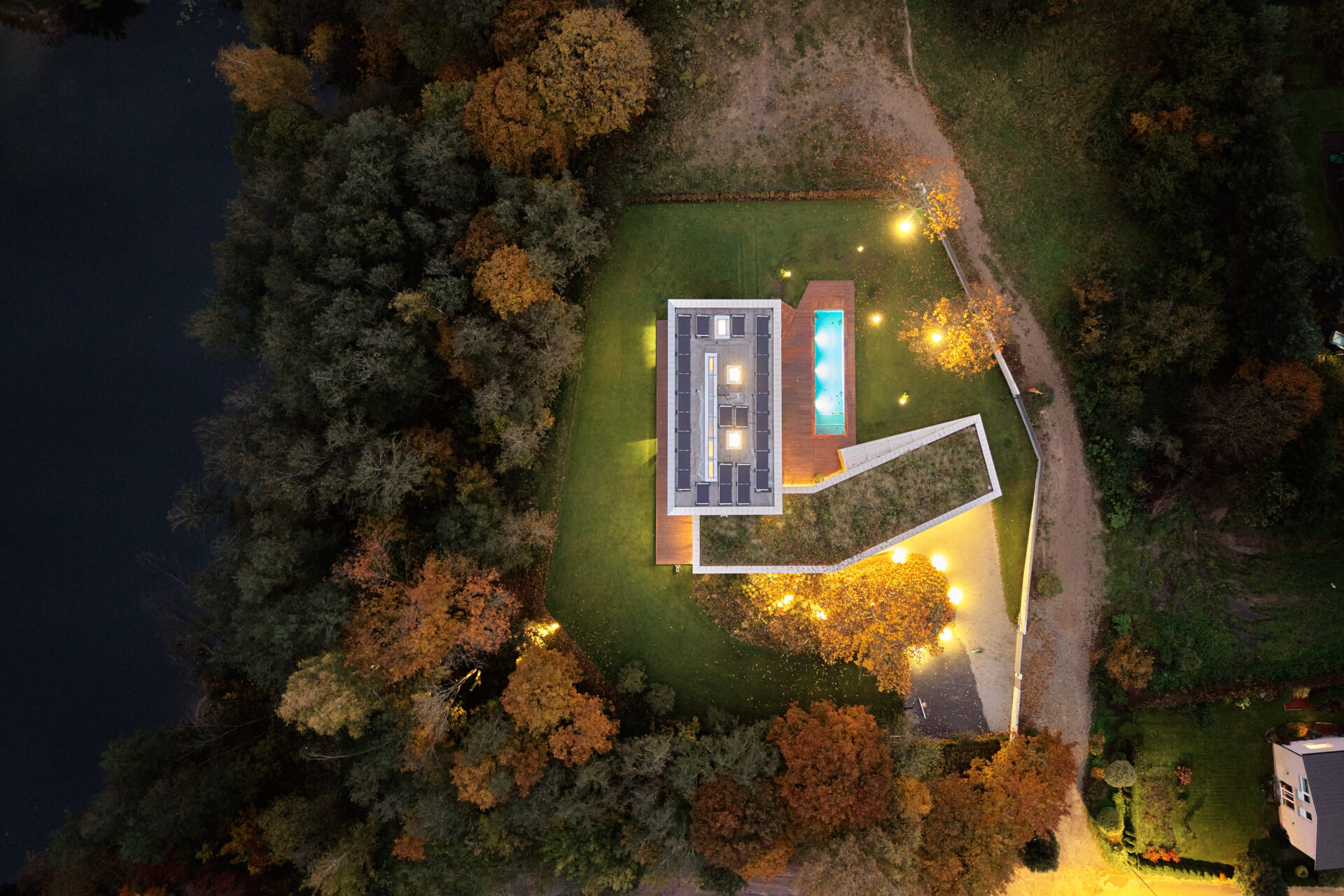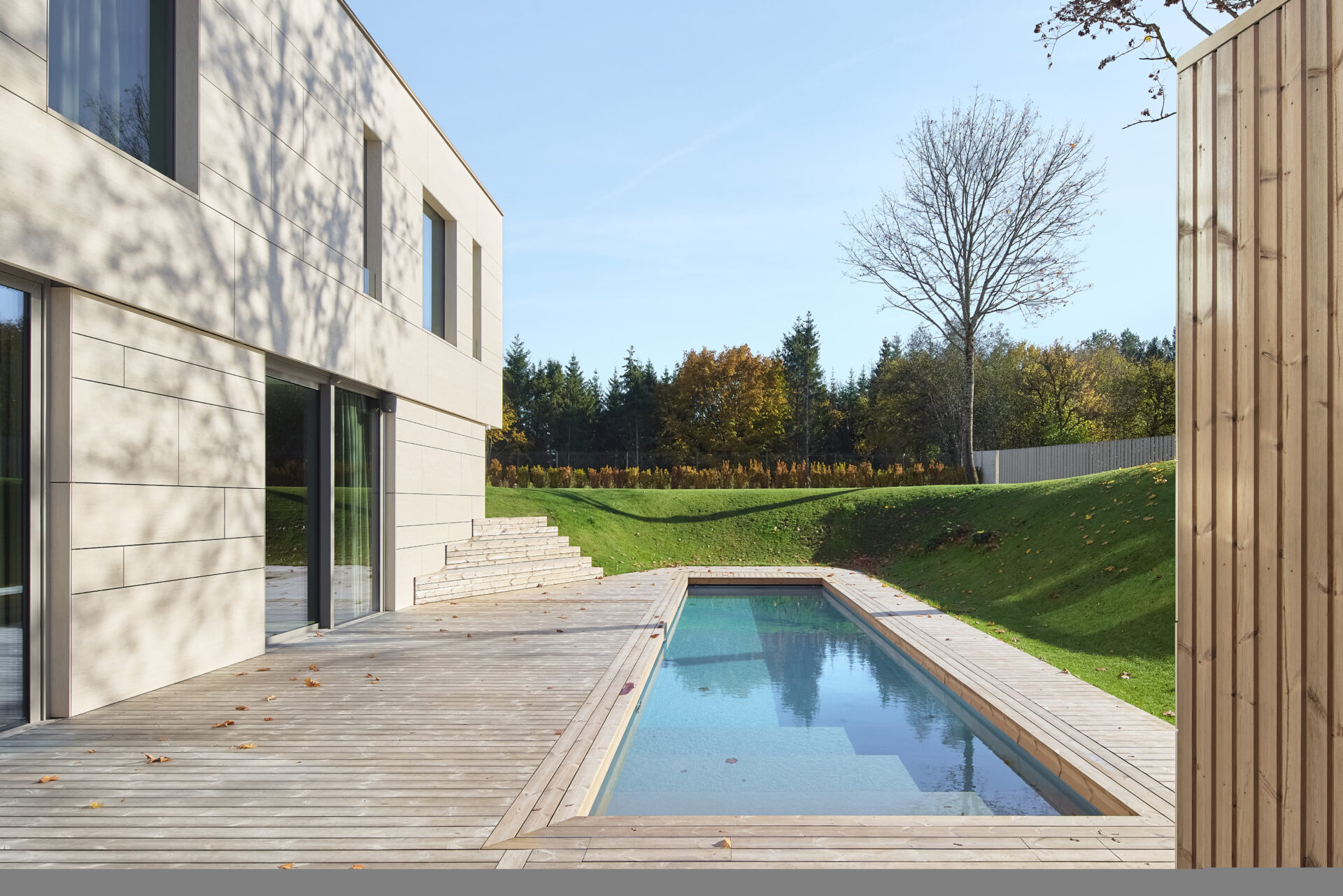 Nuostabus „Abstractus“ (Artūras Mažeika) projektas, kuriame Brolio termo pušies terasinės lentos švelniai apgaubia dangaus mėlynumo baseiną.